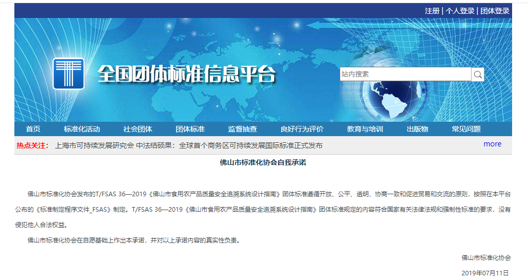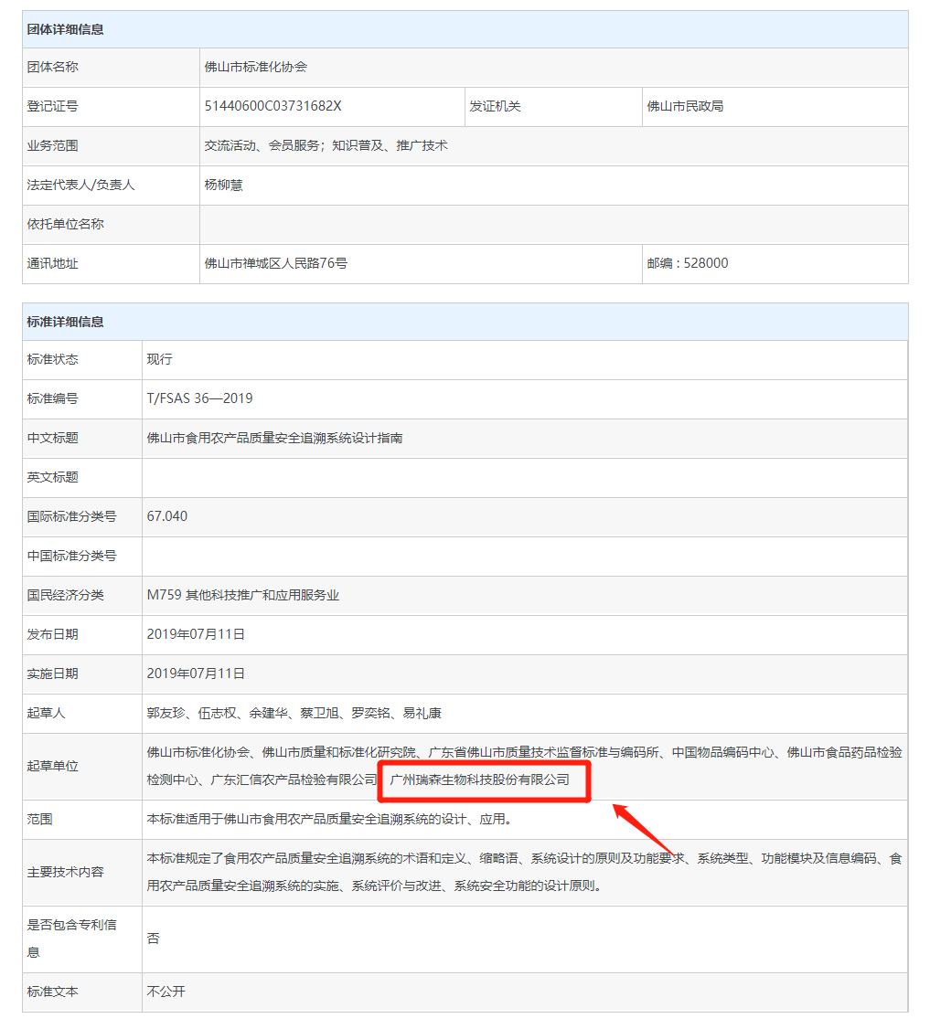 瑞森生物参与制定的T/FSAS 36—2019 《佛山市食用农产品质量安全追溯系统设计指南》团体标准于2019年7月11日在全国团体标准信息平台发布公示。