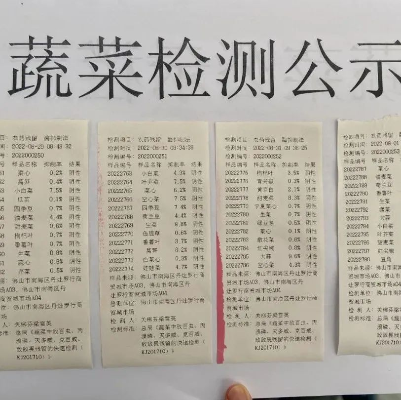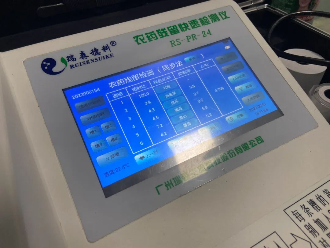 每天早上8点,里水卜蜂莲花超市的工作人员陈漪莉都会随机抽取12批次蔬菜,用全自动农药残留检测仪进行快速检测。“如果发现不合格,我们会下架处理并进行销毁。”