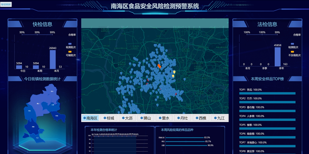 所有检测信息均会实时上传食品安全风险检测预警系统,系统设置“今日镇街检测数据统计”“本年检测合格率”“本周风险较高的样品品种”“本周安全用品TOP”“快检信息”“法检信息”六大模块内容,对收集到的数据进行分析,形成“南海区食品快检数据”地图。