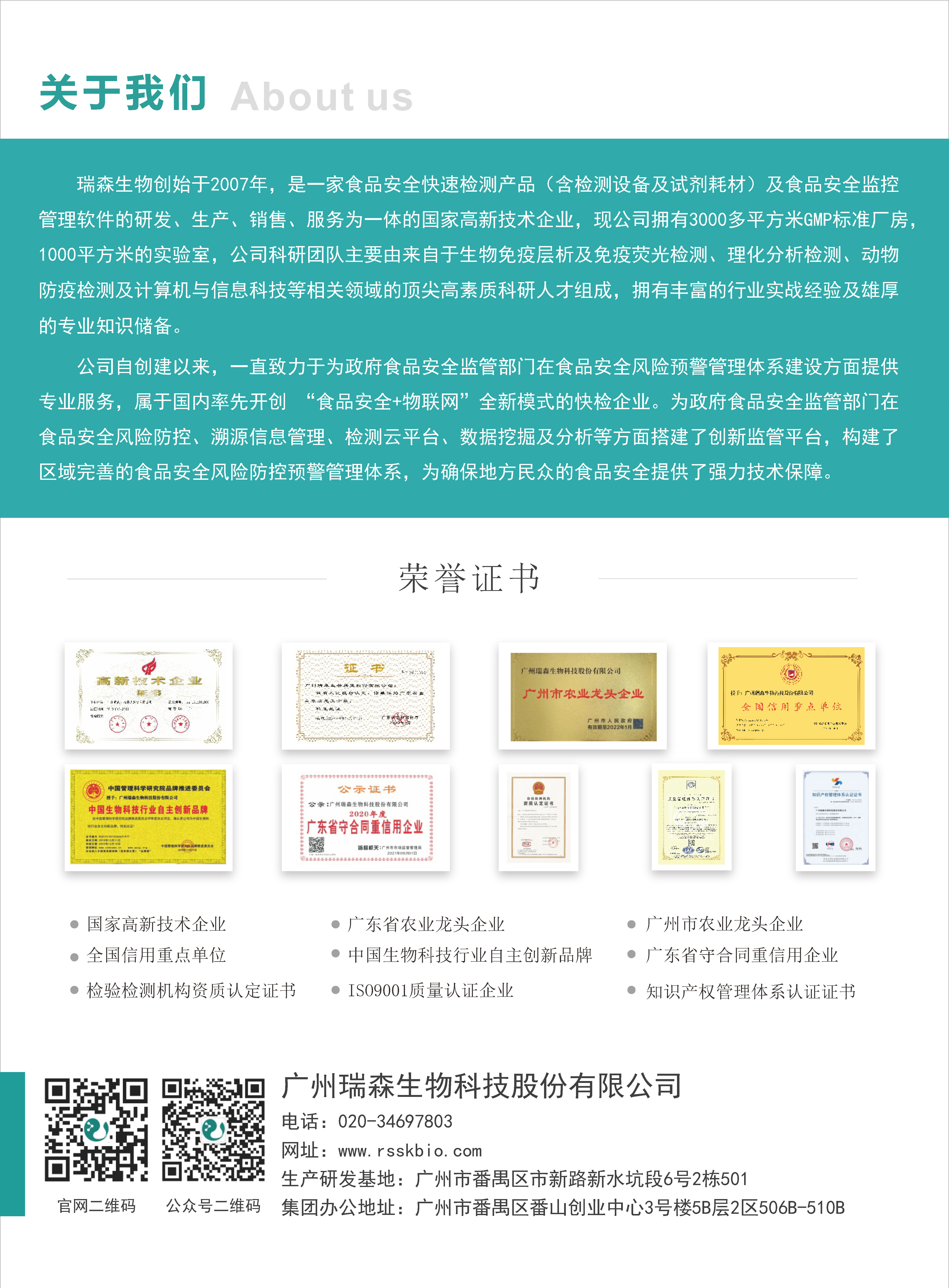 瑞森生物作为广东省重点农业龙头企业,一直致力于食品安全检测行业,至今已深耕十六年之久。公司在食品安全检测领域发挥了技术优势,凭借精湛的技术为客户提供优质、稳定、可靠的产品,为国人食品安全保驾护航,也为推动食品检测行业高质量发展贡献了企业力量。公司属国家高新技术企业,广东省重点农业龙头企业,广州市农业龙头企业,全国重点信用单位,广东省守合同重信用企业,中国生物科技行业自主创新品牌企业,目前拥有国家专利29项,国家软件著作权18项,高新技术产品15项,技术项目研发5项。公司现拥有快速检测试剂和设备上百种,核心产品通过农业农村部验证,可为监管部门、农牧企业、经销商提供专业、全面的检测产品和服务。免责声明:文章、视频、图片等所有内容,仅用于学习交流,若有侵权内容及其他涉法内容,请及时联系删除或修改。