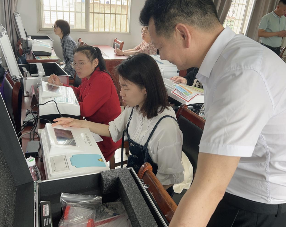 在培训会上,贵溪市农粮局为全市18个乡镇统一配备胶体金、酶抑制多功能快速检测仪,局分管领导熊天云就新设备使用、豇豆种植及检测相关注意事项做了强调,并要求大家坚决贯彻落实新农安法,严格按照部省共建有关要求开展农安工作,确保及时有效发现并处置农产品质量安全风险,确保胶体金免疫检测任务全部按时完成。 瑞森生物技术人员在本次培训会上,通过现场操作示教的方式,为现场与会人员生动详细的培训了胶体金快速检测仪的操作使用方法、使用胶体金检测卡对蔬菜农药残留进行快速检测示范操作以及畜禽产品兽药残留检测等相关内容。并现场考核了各乡镇检测人员对韭菜、空心菜、西葫芦、猪肉、牛尿等常见农产品的胶体金卡检测操作能力。